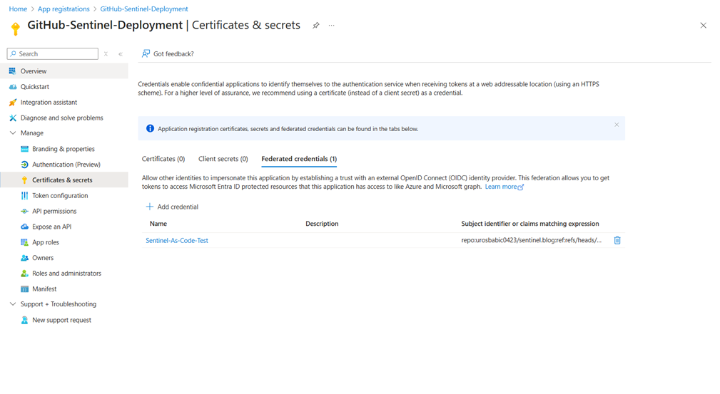 Once your app registration is created, you’ll need to set up the federated identity credentials: