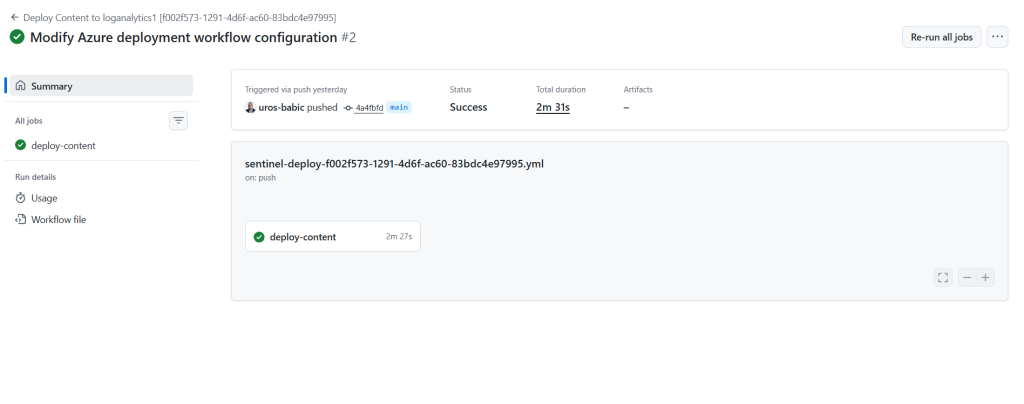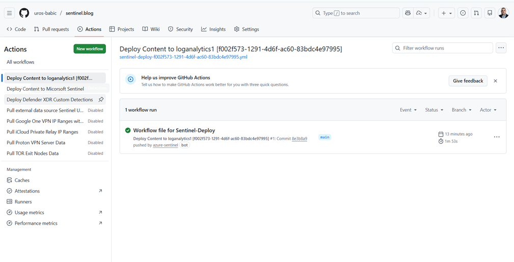 This confirms that the GitHub Action workflow for deploying Microsoft Sentinel content ran successfully. The workflow is triggered by a push to the main branch and uses the YAML file sentinel-deploy-sentinel-as/code.yml.