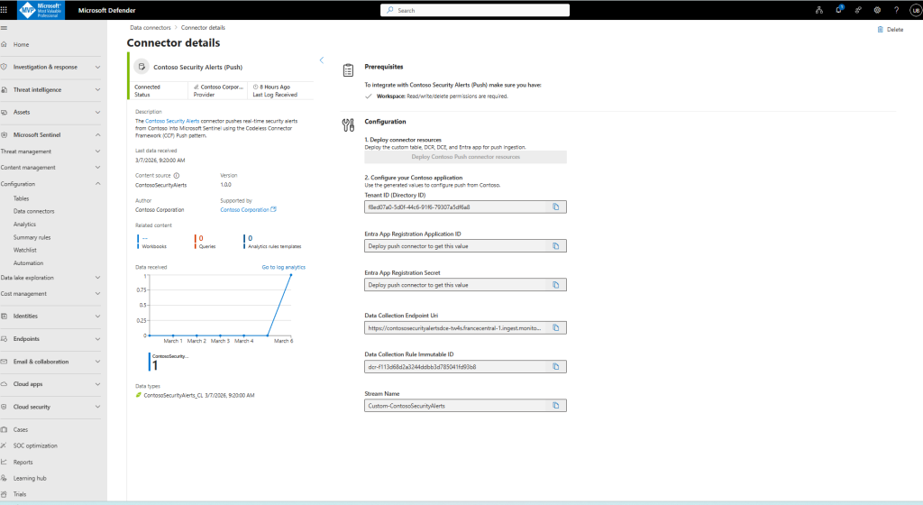 For this post, I took a different path: I used the Microsoft Sentinel Codeless Connector Framework (CCF) to onboard a custom data source (Contoso Security Alerts) with a Push integration model.