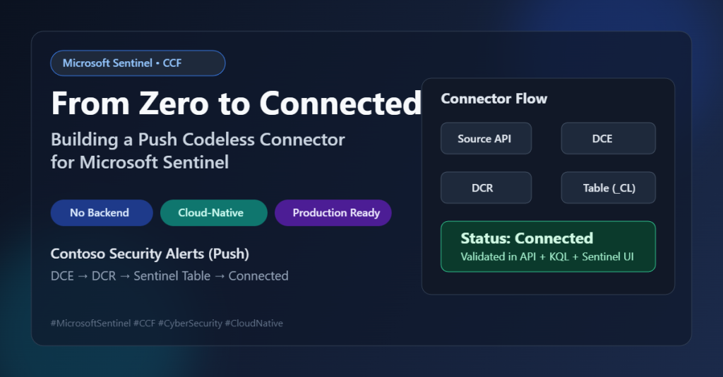 Building this connector with Microsoft Sentinel’s Codeless Connector Framework demonstrated how far the platform has evolved in enabling fast, maintainable, and production-grade data ingestion — without writing or operating any custom middleware. By relying on declarative components such as Data Collection Rules (DCR), Data Collection Endpoints (DCE), and stream-bound schemas, the entire pipeline becomes predictable, observable, and easy to validate end-to-end.