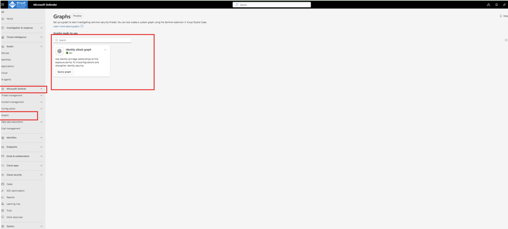 We enabled and configured the Sentinel Graph, which provides a relationship‑based view of identities, their access to cloud resources, and the potential paths an attacker could exploit for privilege escalation and lateral movement.