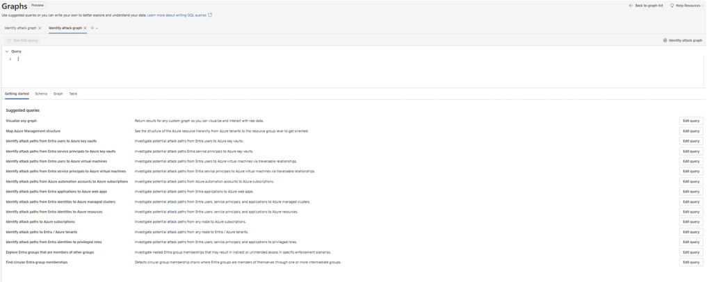 Below the query editor, the interface displays a list of pre‑built suggested graph queries, designed to accelerate investigations.